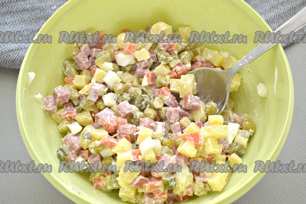 Нарезанные картофель, копчёную колбасу, морковку, яйца, огурец соединяем в миске, добавляем горошек и майонез, перчим и подсаливаем по вкусу.