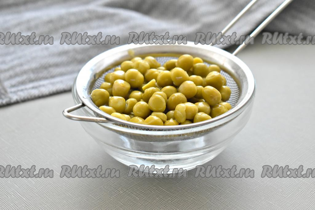 Зелёный консервированный горошек из банки перекладываем на сито (или на дуршлаг). Ждём, пока жидкость полностью сольётся.