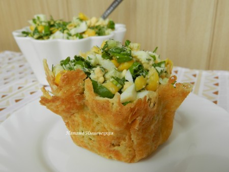 Сырные корзинки можно заполнить любым салатом по вашему вкусу и у вас получится оригинальная закуска.