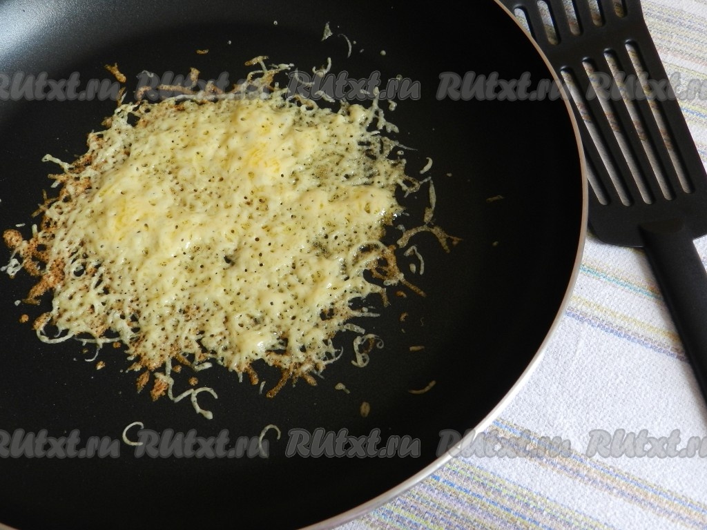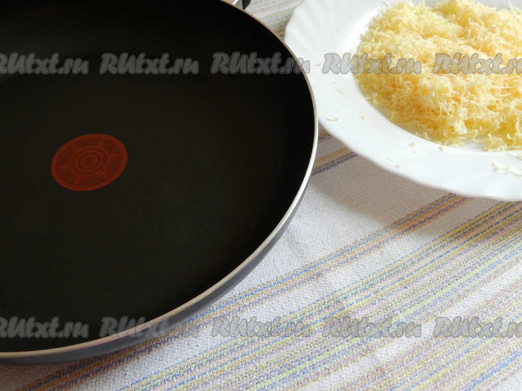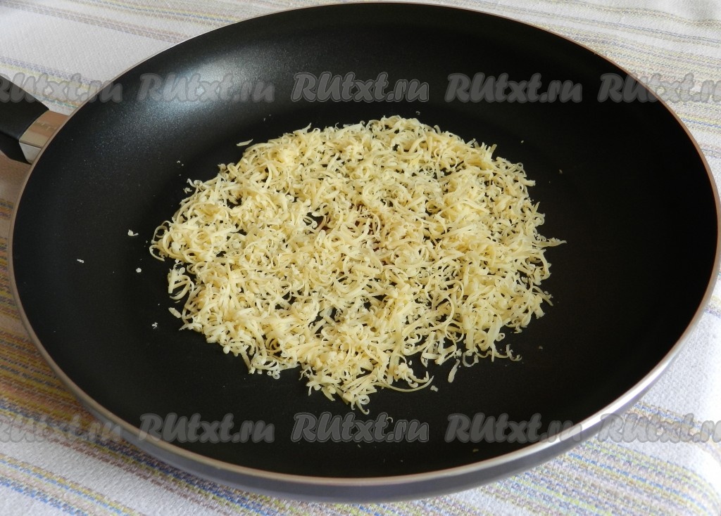 Сковороду разогреть, насыпать на нее небольшое количество натертого сыра тонким слоем.