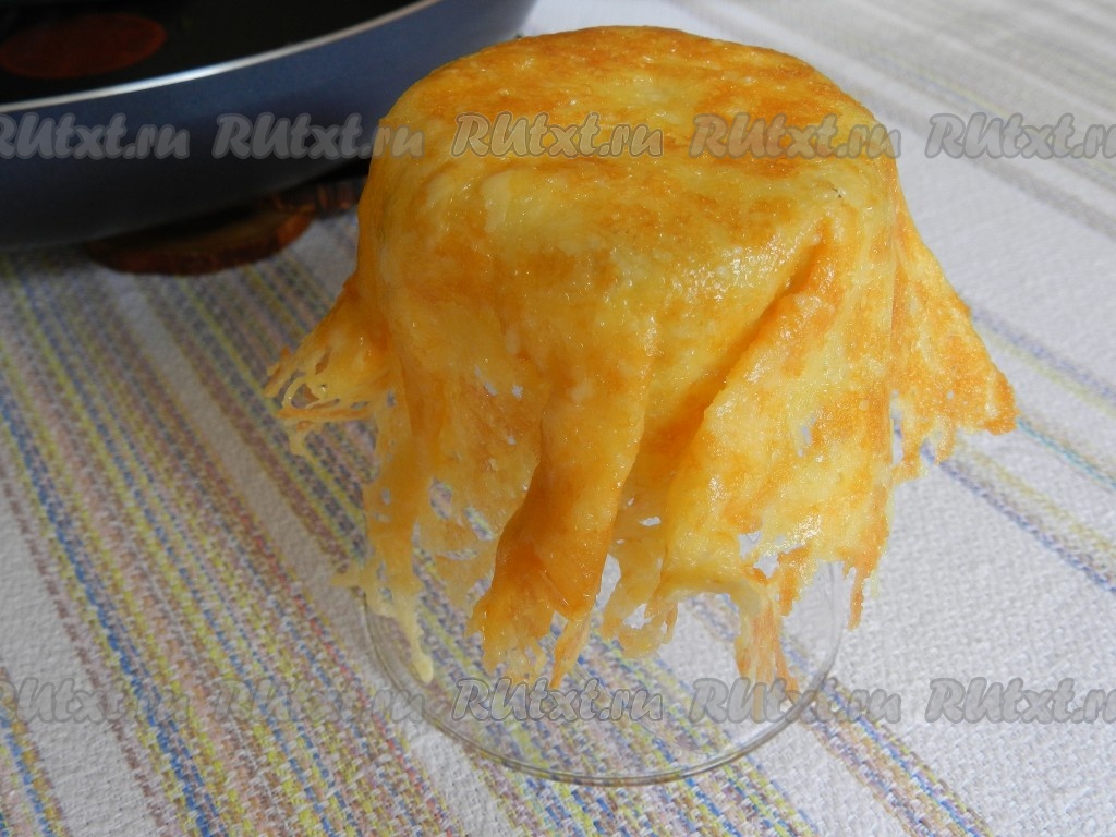 Через несколько секунд поддеть сыр лопаткой (расплавленный сыр легко снимается со сковороды), и быстро накрыть им дно перевернутого стаканчика, немного прижать руками, придав сырной корзинке форму.
