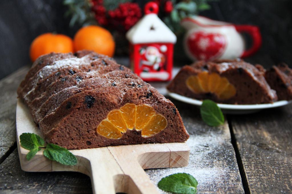 Нарезать ароматную, нежную выпечку на кусочки и подать к столу. А вот какой аппетитный разрез у нашего шоколадного кекса с мандаринами.