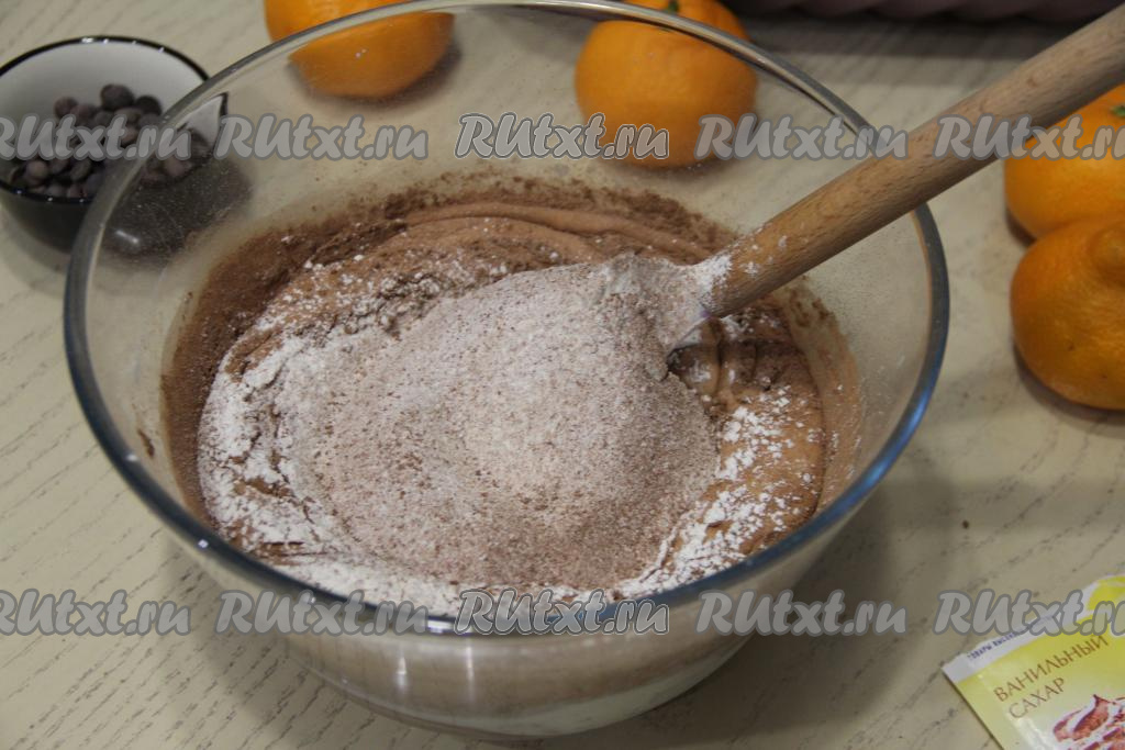Перемешать лопаткой. Всыпать просеянную муку и корицу.
