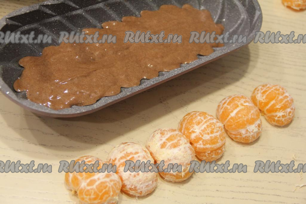 Мандарины заранее почистить и разделить на половинки. В форму вложить половину теста. Я выпекала в литой форме размером 32х14 сантиметров и предварительно её не смазывала маслом, но тут всё зависит от качества формы.