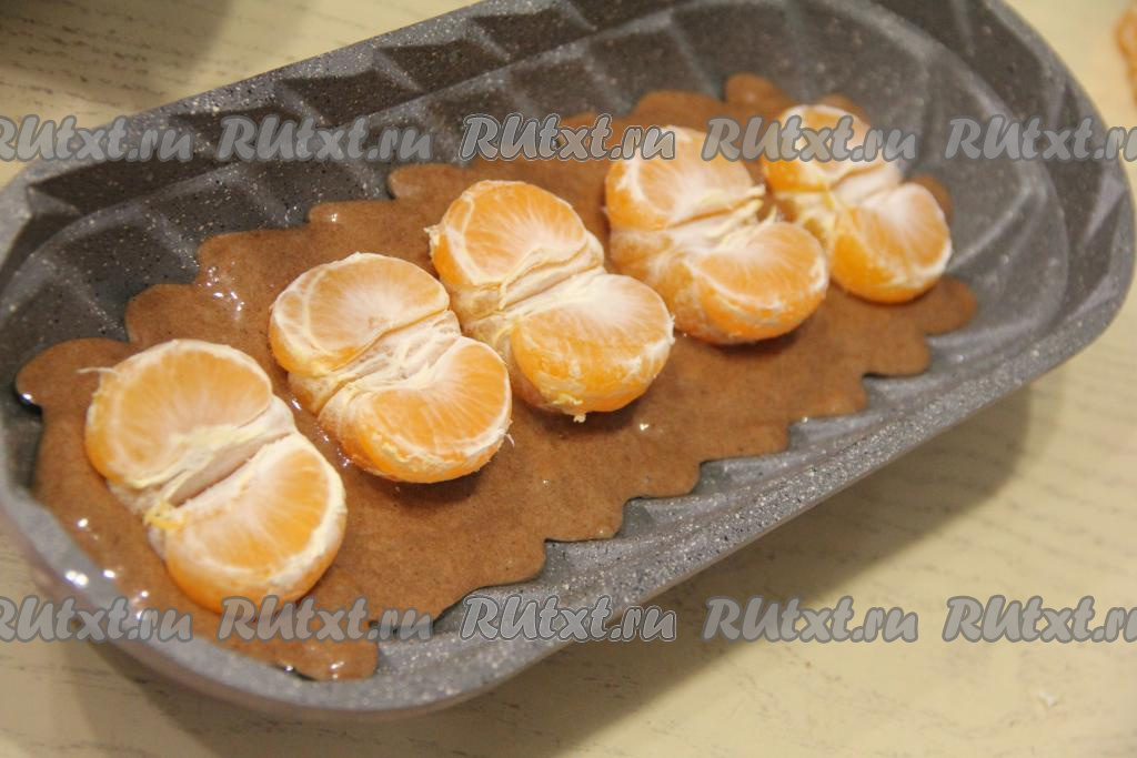 Аккуратно выложить мандарины на тесто, как на фото.