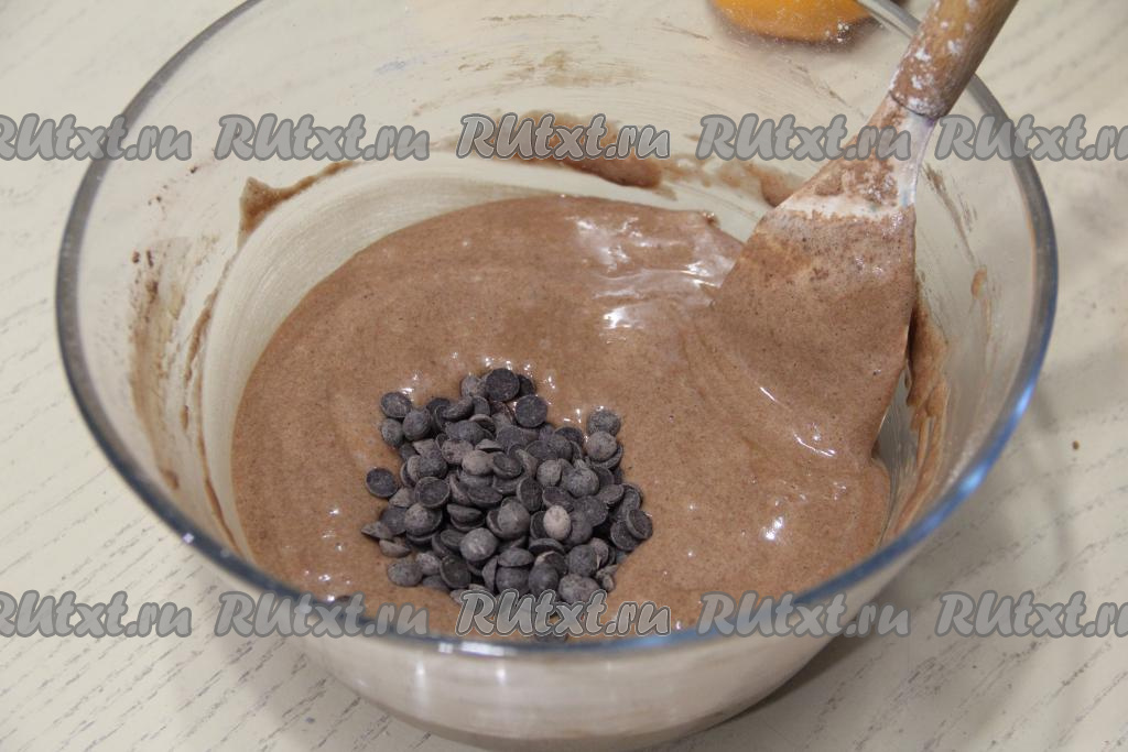 Ещё раз перемешать тесто лопаткой до однородного и гладкого состояния. Затем влить растительное масло и вмешать его в тесто. Я дополнительно добавила капли шоколада, можно их заменить на колотый шоколад или вообще не добавлять, перемешать. Тесто получится воздушным, напоминающим сметану средней густоты.