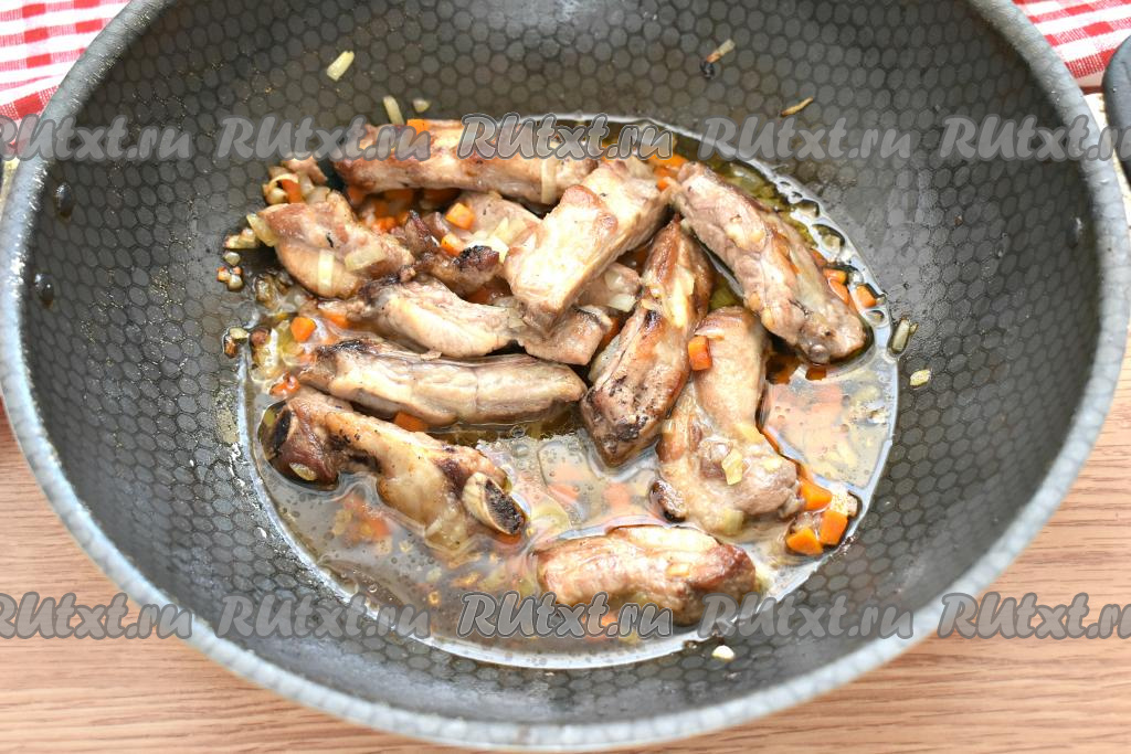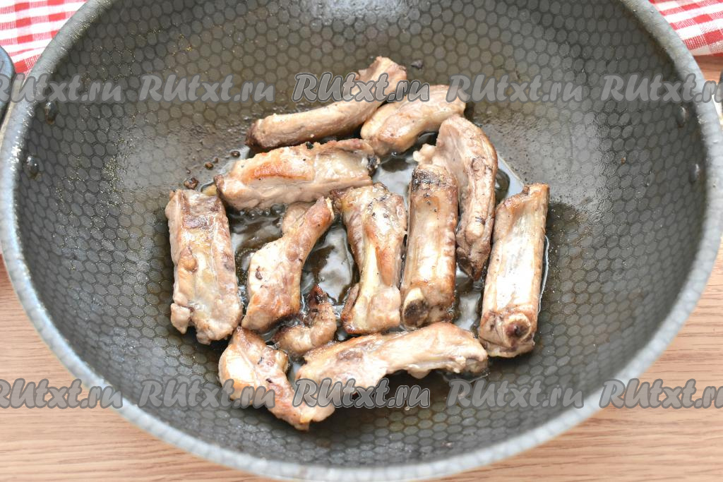 Я буду готовить плов в глубокой сковороде, также можно взять казан или утятницу. Вливаем на сковороду растительное масло и прогреваем его. Выкладываем свиные рёбрышки и на достаточно сильном огне обжариваем их, иногда перемешивая, примерно 10 минут. Рёбрышки должны со всех сторон покрыться золотистой корочкой.