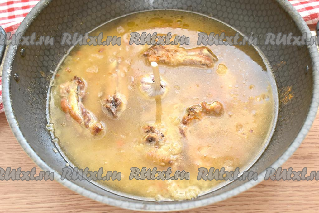 Заливаем рис с рёбрышками 2 стаканами тёплой кипячёной воды. В центр втыкаем предварительно хорошо промытую целую головку чеснока, даём воде закипеть, накрываем крышкой.