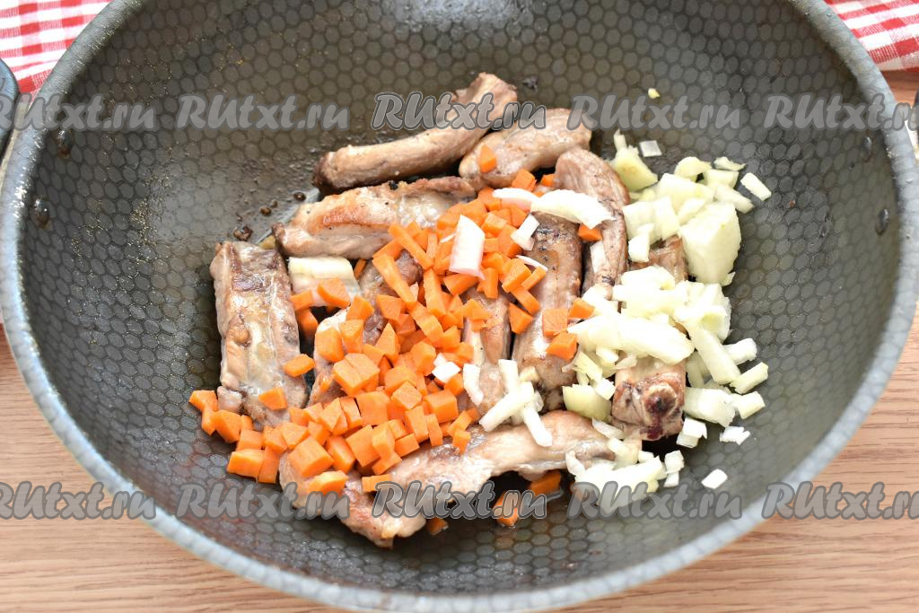 Очищаем морковку с луком. Лук нарезаем на небольшие кусочки, а морковку - на кубики (или брусочки). Добавляем лук и морковку к обжаренным рёбрышкам, перемешиваем. Убавляем огонь до среднего. Жарим, рёбра с овощами, иногда помешивая, 5 минут.