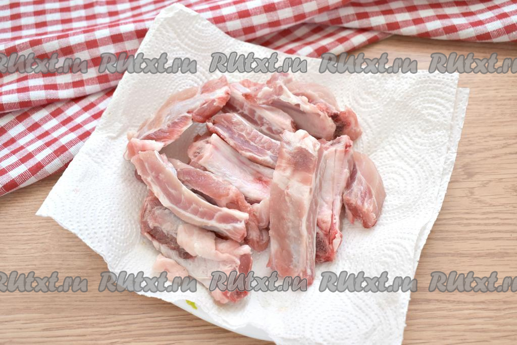 Рёбрышки моем, обсушиваем и нарезаем на порционные кусочки по мясистой части возле косточки. Я готовила плов с пропаренным рисом, его можно не промывать водой (все остальные виды риса желательно промыть водой и дать стечь лишней жидкости).