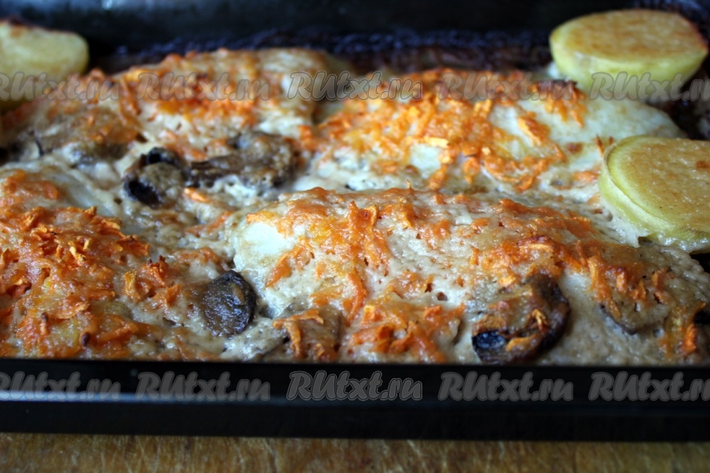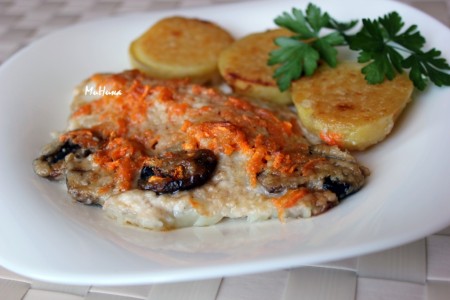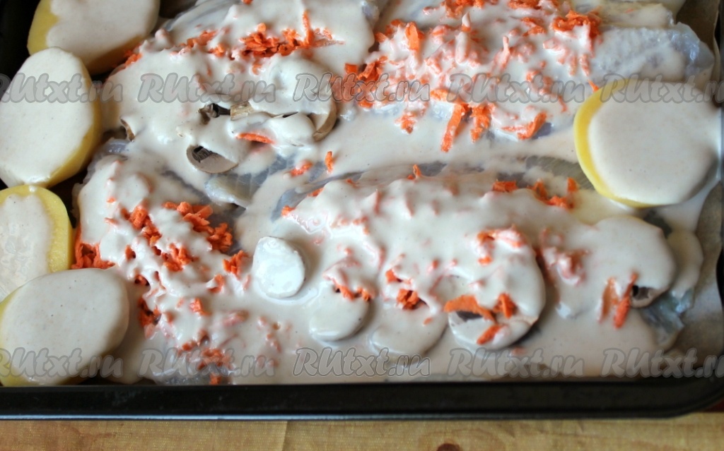 На смазанный противень или на бумагу для запекания положить филе тилапии, на него выложить порезанные шампиньоны и тёртую морковь.
