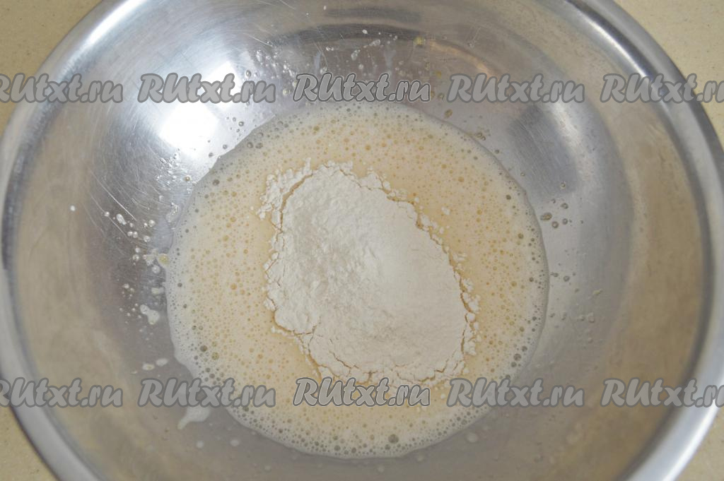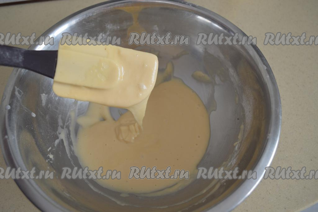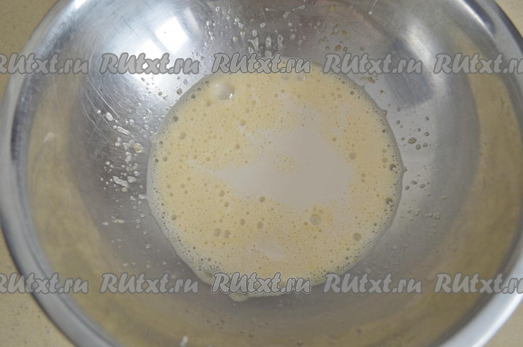 Перемешать яичную массу с молоком и всыпать муку. Муки, возможно, понадобится чуть больше или чуть меньше, тут лучше следить за консистенцией теста.