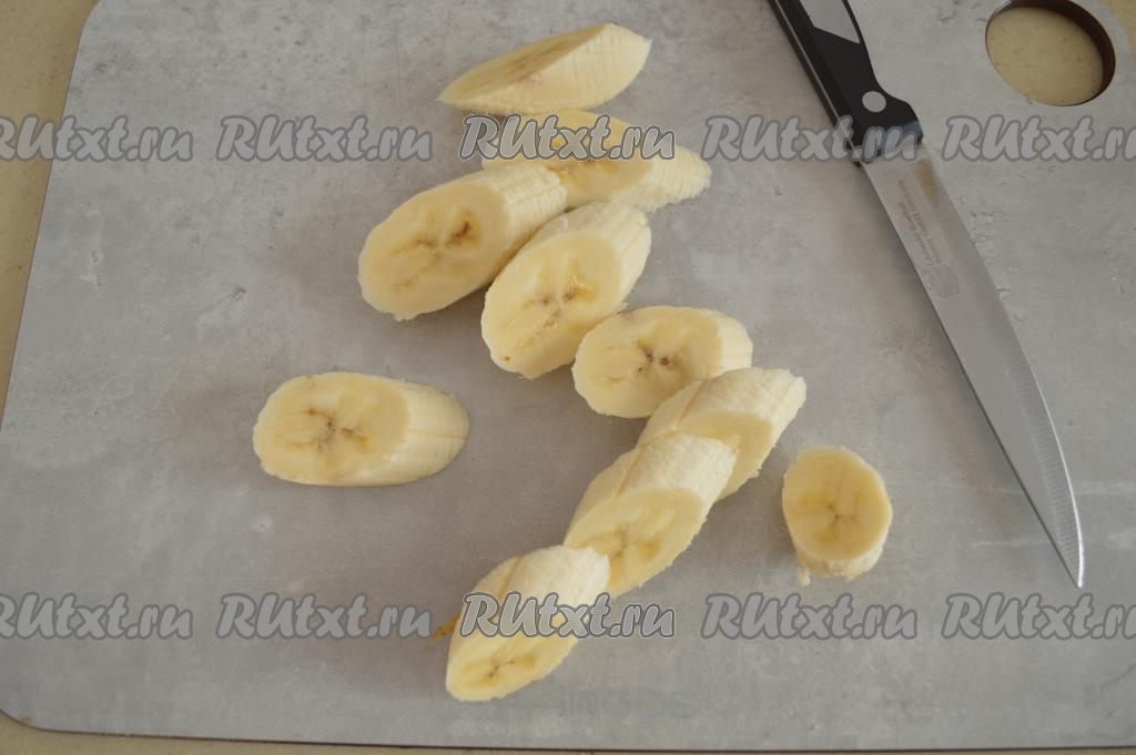 Банан очистить от кожуры и нарезать наискосок на кусочки толщиной примерно 5 миллиметров.