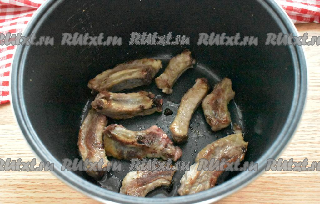 В чашу мультиварки (у меня - мультиварка Редмонд) вливаем 2 столовых ложки растительного масла. Включаем режим "Жарка" на 30 минут. Когда масло разогреется (прозвучит звуковой сигнал), в чашу выкладываем рёбрышки и обжариваем их 15 минут, иногда перемешивая.