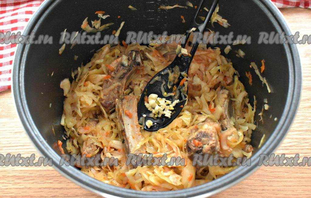 После завершения режима "Тушение" открываем мультиварку, добавляем к тушёной капусте и свиным рёбрам измельчённый зубчик чеснока, перемешиваем.