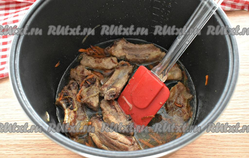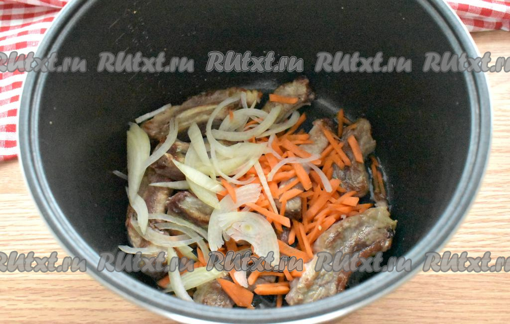 Через 15 минут к рёбрышкам добавляем морковь, нарезанную на тонкие брусочки, и лук, нарезанный полукольцами, обжариваем овощи с мясом, периодически перемешивая, до окончания программы "Жарка".
