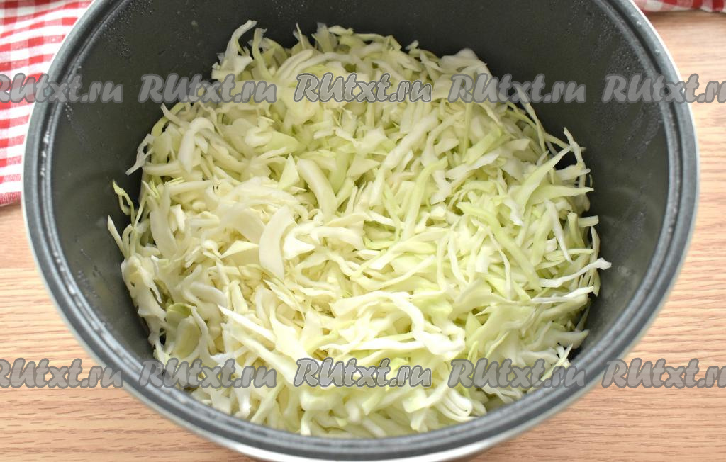 Через полчаса крышку открываем, в чашу к рёбрышкам добавляем тонко нарезанную капусту, перемешиваем, крышку закрываем.