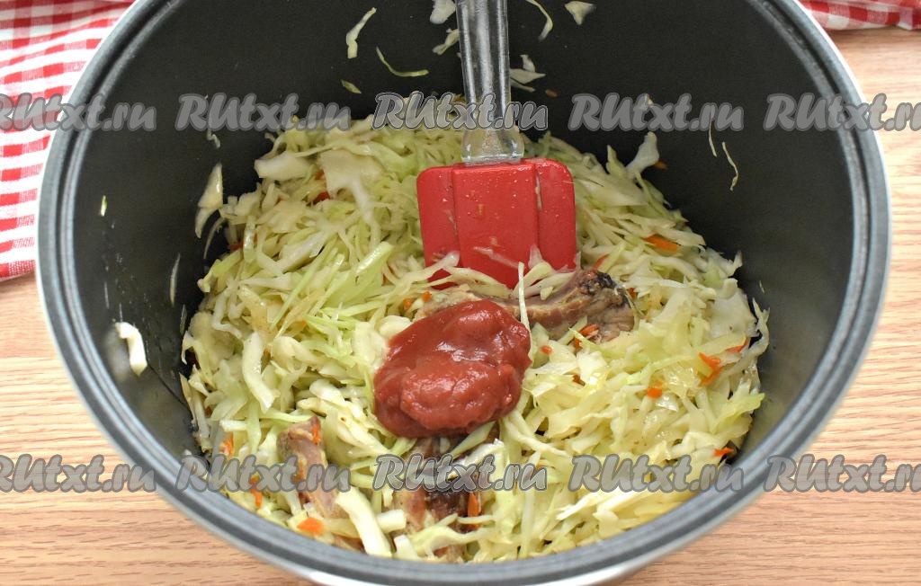 Через 10 минут после того, как мы добавили к рёбрышкам капусту, выкладываем к ней томатную пасту, перемешиваем. Мультиварку опять закрываем и продолжаем тушить оставшиеся 40 минут. За это время капусту с мясом нужно 2-3 раза перемешать.