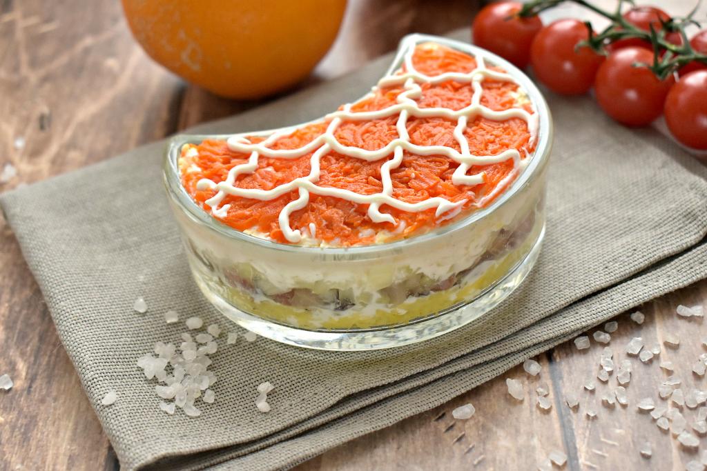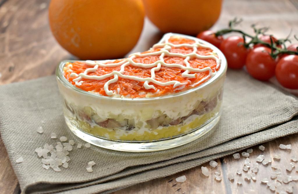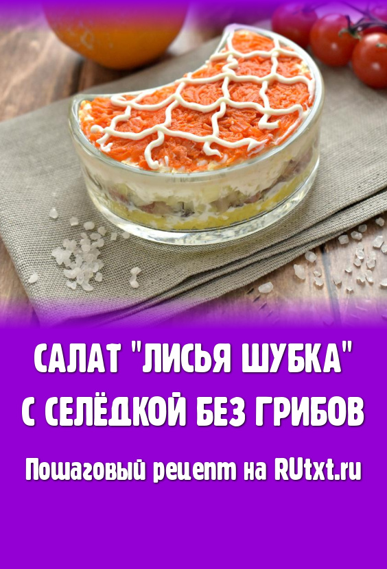 Вкусный, яркий, сочный слоёный салат "Лисья шубка", приготовленный с селёдкой, станет украшением праздничного стола. Несмотря на отсутствие грибов, блюдо получается достаточно сытным.