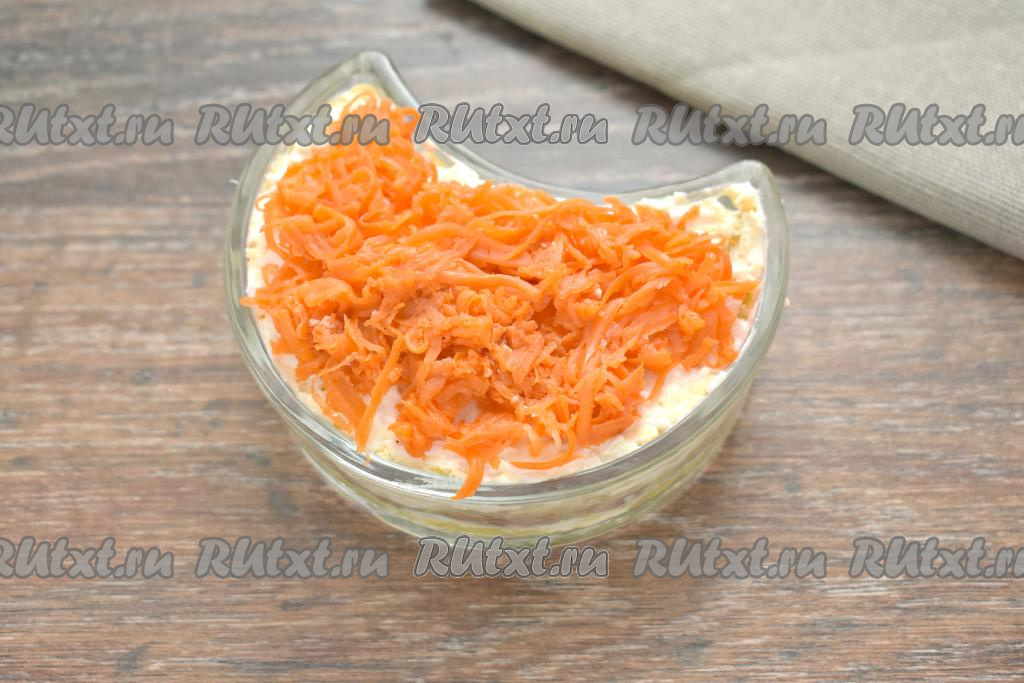 Завершающим слоем салата "Лисья шубка" выкладываем морковку, натёртую на крупной тёрке. Аккуратно распределяем морковь по поверхности салата.