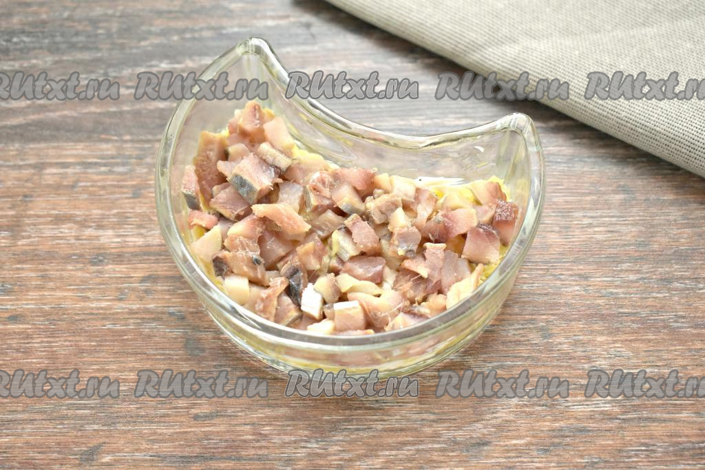 Филе сельди тщательно осматриваем, убирая косточки, после этого нарезаем на маленькие кубики и выкладываем равномерно поверх слоя картофеля.