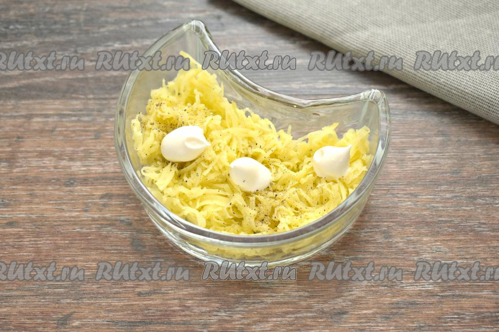Следующим слоем будут натёртые на крупной тёрке яйца, немного перчим и солим их, наносим майонез.
