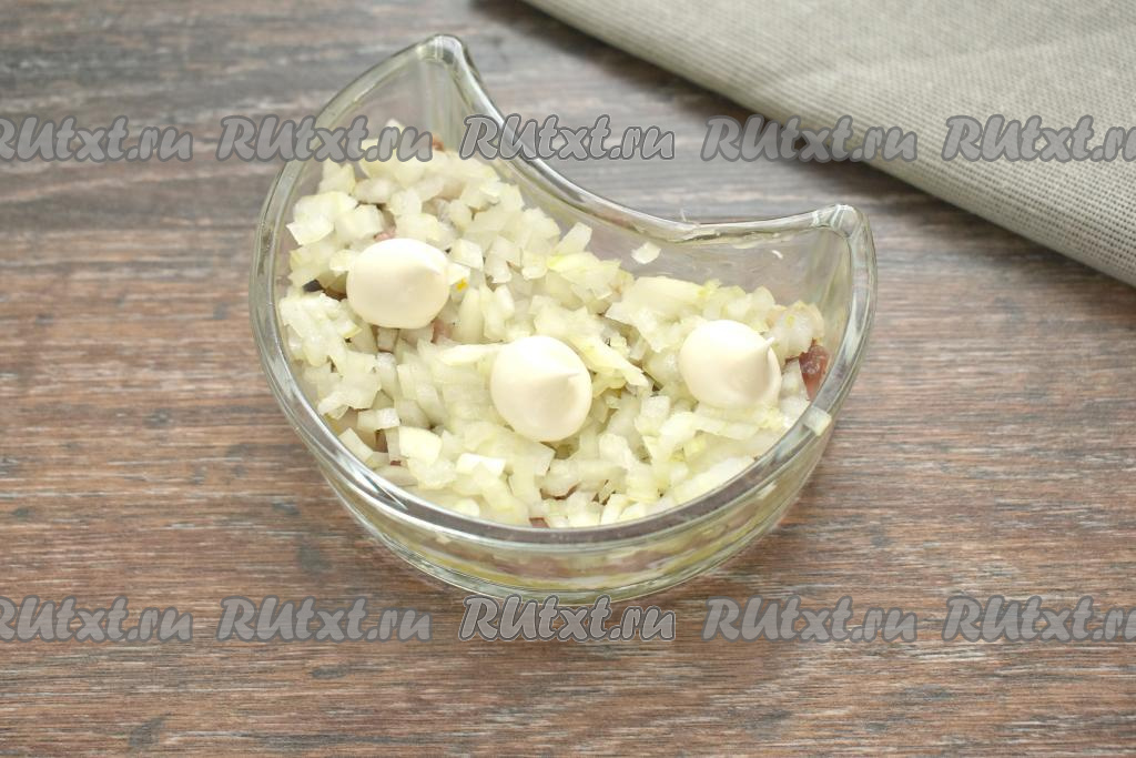 Очищенную луковицу мелко нарезаем и раскладываем поверх селёдочки, покрываем майонезом.