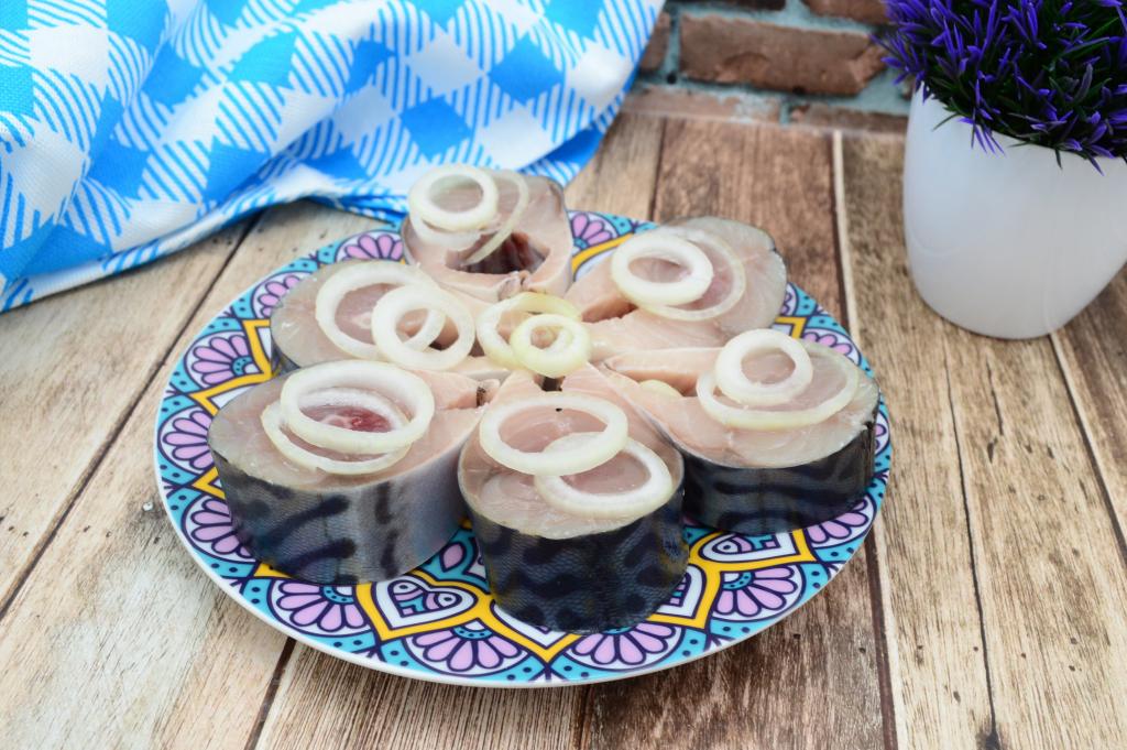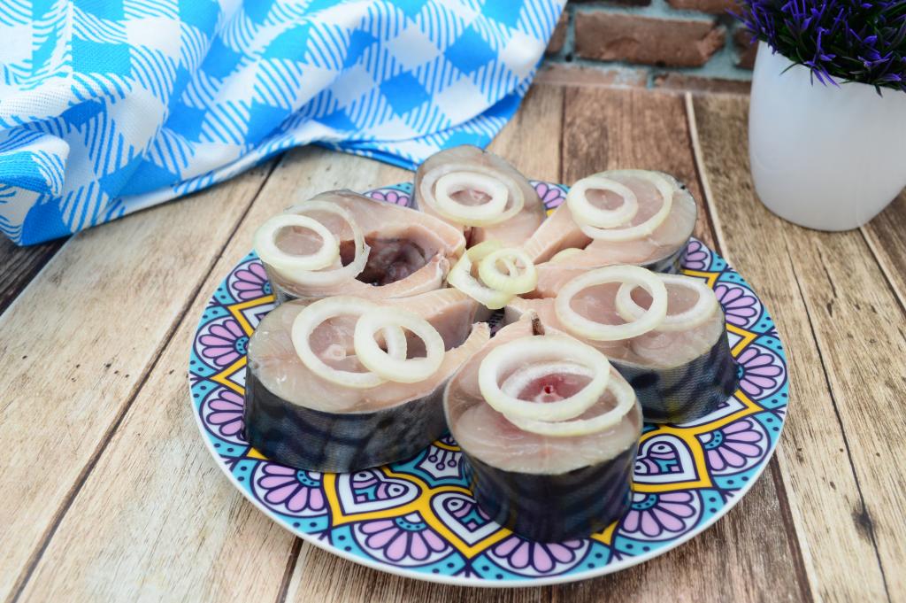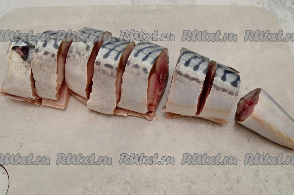 Разрезать скумбрию острым ножом на кусочки толщиной 2,5-3 сантиметра.