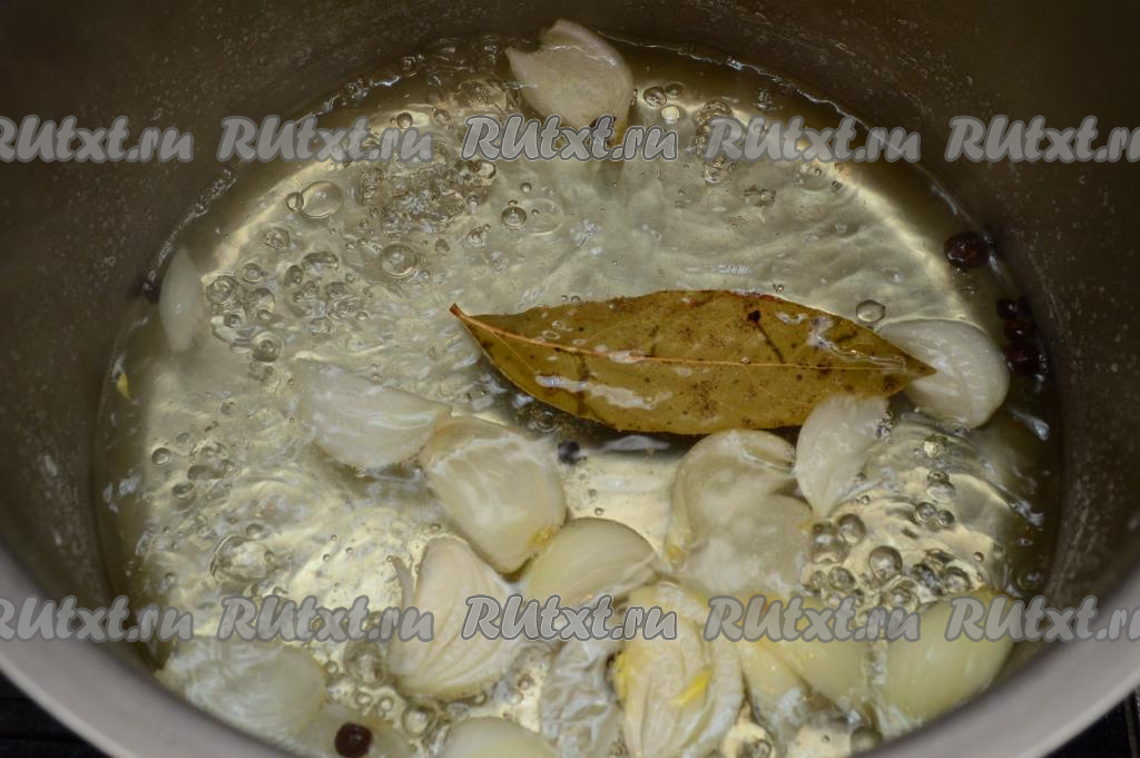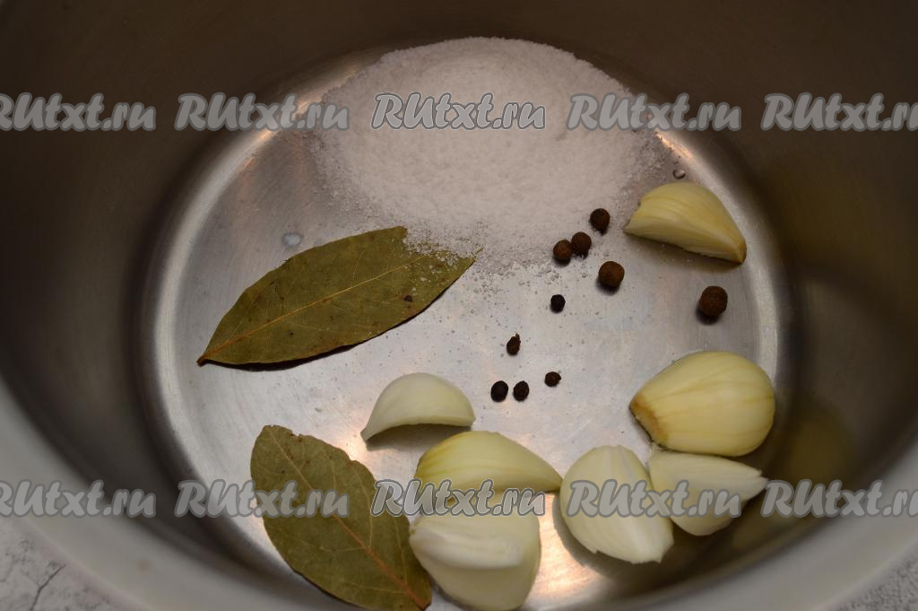 Для приготовления рассола в кастрюлю насыпать соль, добавить чёрный и душистый перцы, а также очищенную среднюю луковицу, разрезанную на 4-6 частей (я взяла 2 маленьких луковицы и разрезала каждую на 4 части) и лавровые листья.