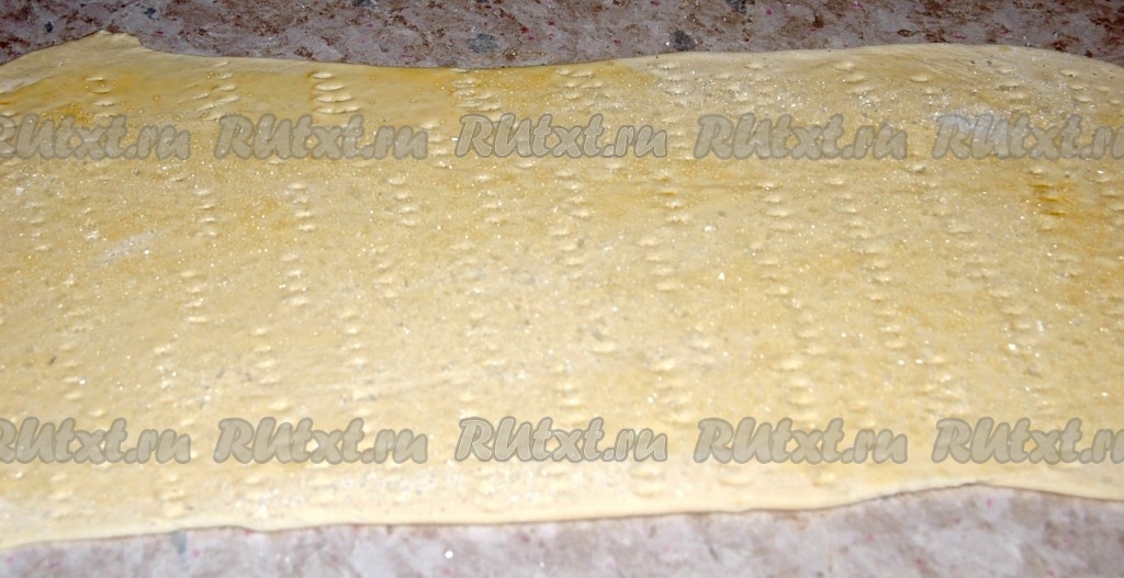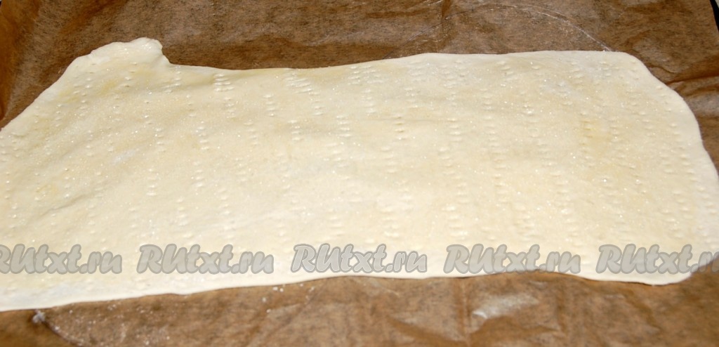 По всей поверхности пласта теста сделать проколы вилкой, чтобы при выпечке корж не вздувался.