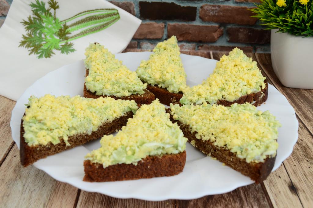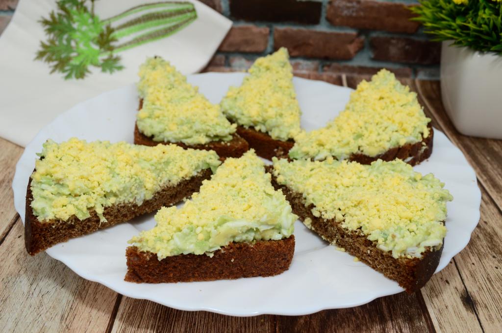 Кусочки чёрного хлеба разрезать на треугольники и смазать их подготовленной начинкой из авокадо, творожного сыра и белка.