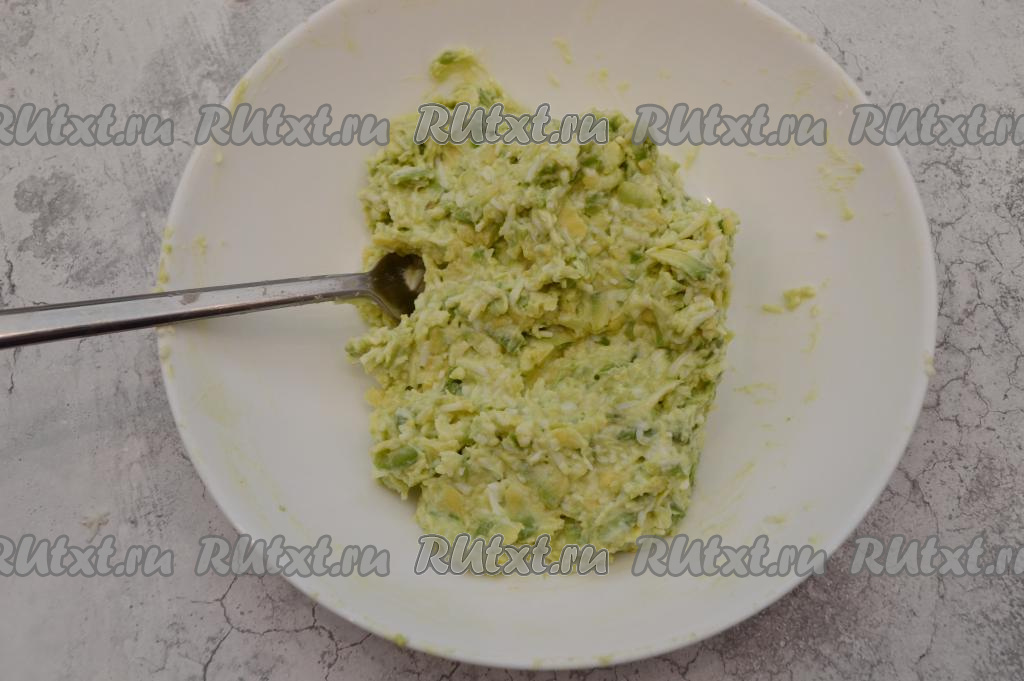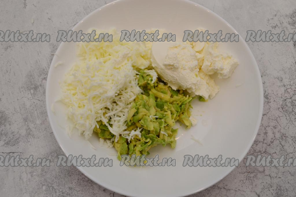 Посолить смесь авокадо, яиц и творожного сыра по вкусу и перемешать массу вилкой до однородности.