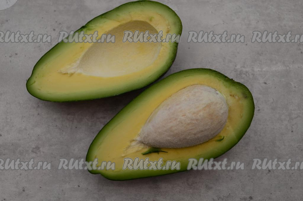 Авокадо разрезать пополам, удалить косточку и срезать кожуру ножом.
