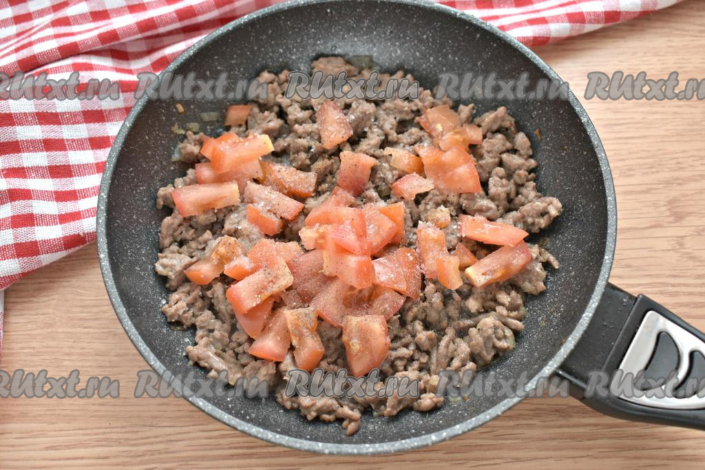 Моем помидор. Кожуру я не убирала, только срезала место, в котором находилась плодоножка. Нарезаем помидор на средние кубики и добавляем к фаршу с луком, солим, перчим, можете добавить свои любимые специи и приправы, перемешиваем. Под крышкой тушим фарш с помидорами 7-8 минут (до готовности мяса), иногда перемешивая.
