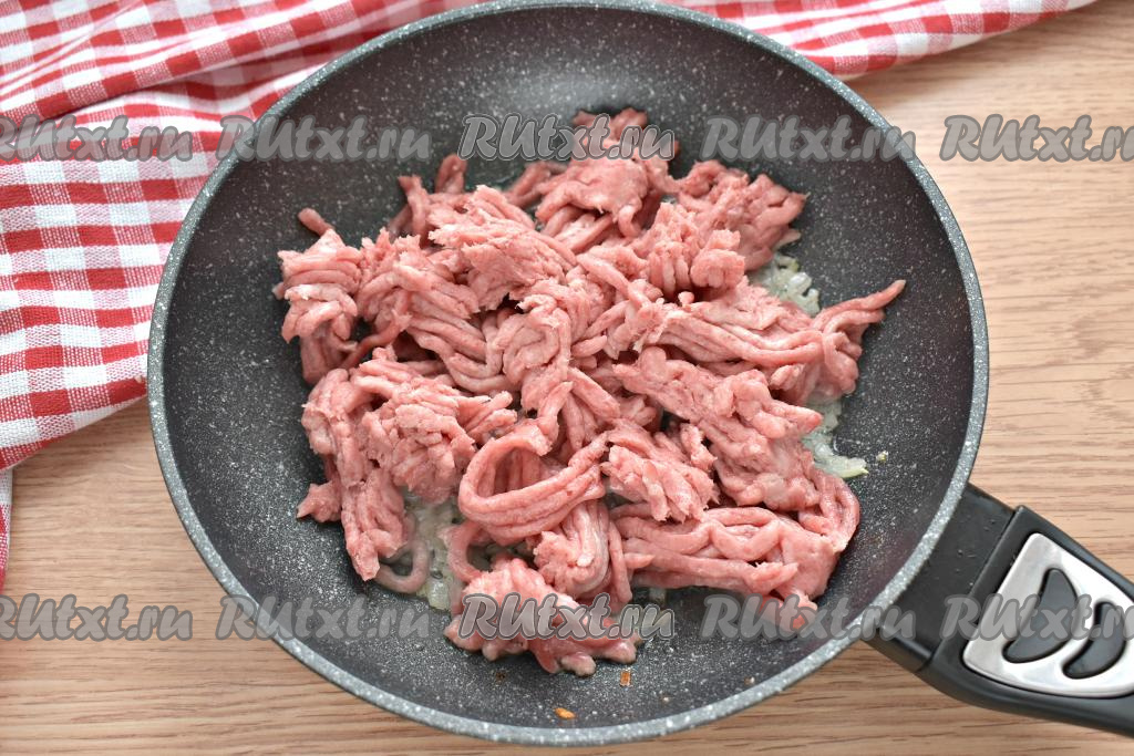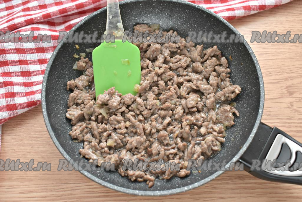Обжариваем мясной фарш с луком 7-8 минут, разбивая кусочки мяса лопаточкой.