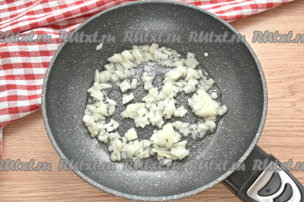 Пока варятся макароны, очищаем небольшую луковицу, мелко нарезаем и выкладываем на прогретую с растительным маслом сковороду. На среднем огне обжариваем лук, иногда перемешивая, 3 минуты (до мягкости лука).