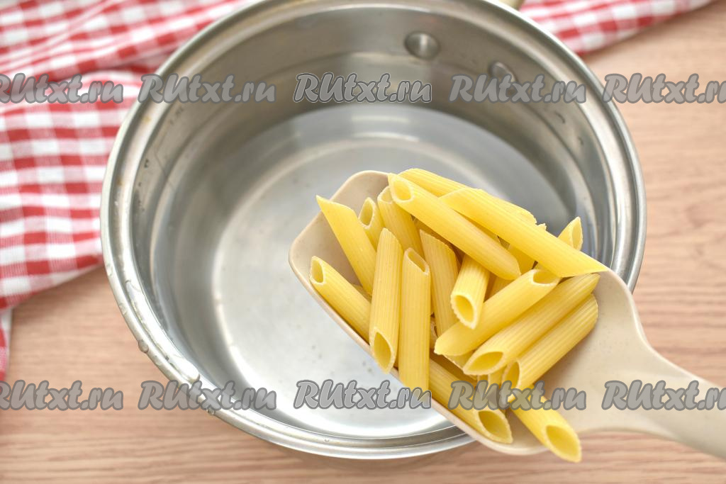 В кастрюлю наливаем 2 литра воды, солим её по вкусу и ставим на сильный огонь, после закипания кладём макароны, перемешиваем их, даём закипеть и, уменьшив огонь, варим до готовности (продолжительность варки смотрите на упаковке макаронных изделий, которые вы готовите, я варила макароны 10 минут). Чтобы макароны не прилипли ко дну кастрюли, периодически их перемешиваем. Затем откидываем макароны на дуршлаг и оставляем их на несколько минут, чтобы стекла вода.