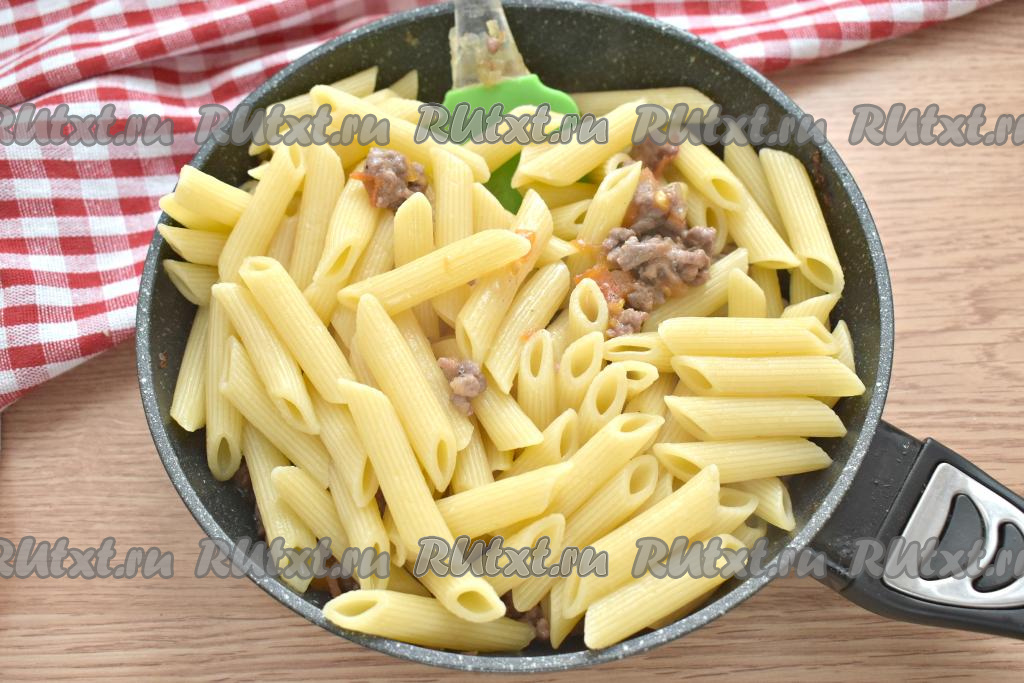 К готовому мясному фаршу выкладываем отваренные макароны, перемешиваем, прогреваем на небольшом огне под крышкой минуты 2-3. За это время пару раз блюдо надо перемешать.