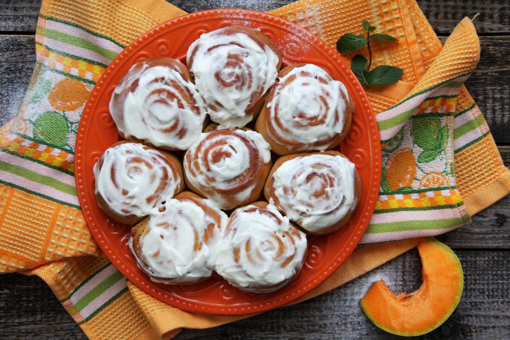 К домашнему чаепитию предлагаю приготовить вкуснейшие синнабоны с добавлением в тесто мякоти тыквы. Тыквенные синнабоны получаются нежными и воздушными, мягкими и в меру сладкими. А благодаря тому, что после выпечки булочки покрываются творожным сыром, смешанным с сахарной пудрой, они становятся очень аппетитными!