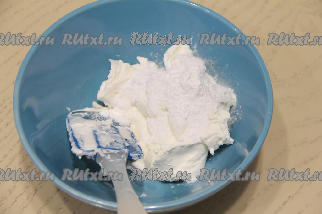 Соединить творожный сыр и сахарную пудру, перемешать.