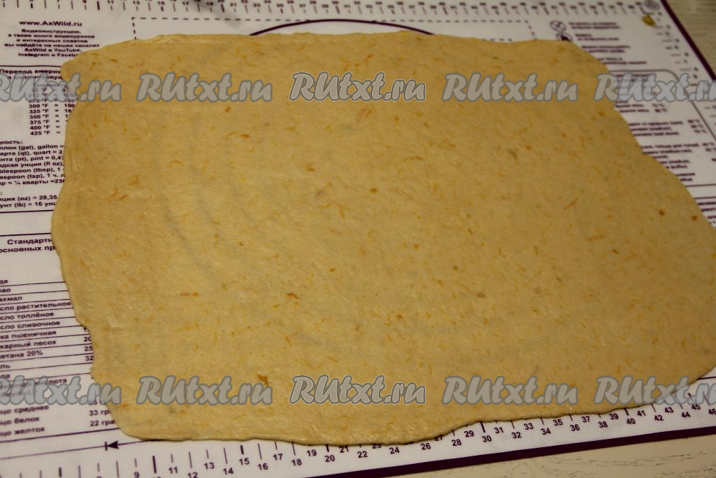 Поднявшееся тесто обмять и на припылённой мукой поверхности раскатать в прямоугольный пласт толщиной примерно 3-4 миллиметра.