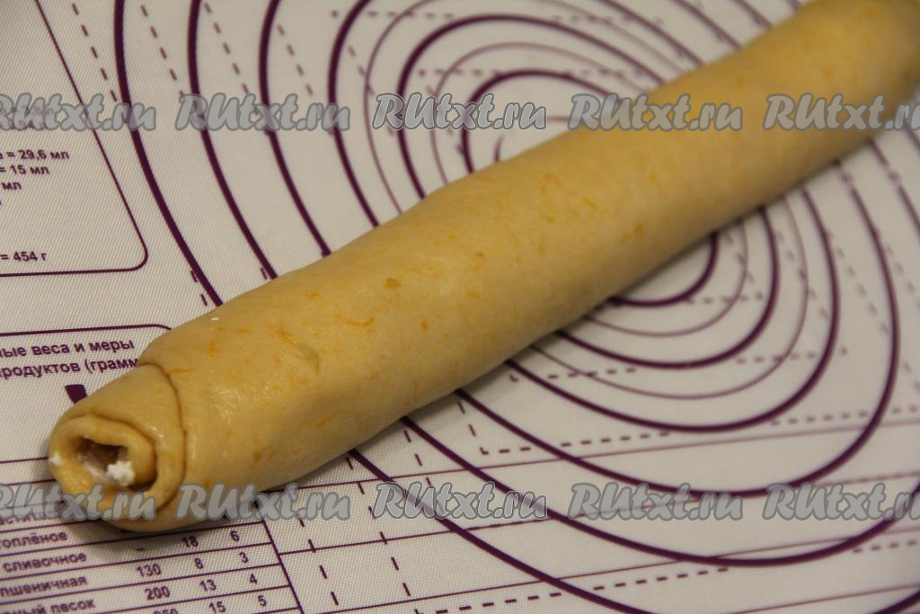 Свернуть тесто в плотный рулет, начиная с широкой стороны.