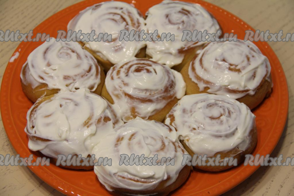 Ещё горячие тыквенные синнабоны смазать смесью творожного сыра и сахарной пудры, слегка остудить выпечку.