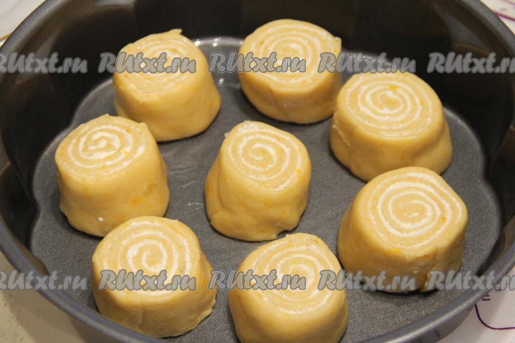 Выложить заготовки тыквенных синнабонов на небольшом расстоянии друг от друга в форму для выпечки, смазанную маслом. Я часть булочек выложила в форму, а оставшиеся разместила на смазанном маслом противне. Оставить синнабоны минут на 30, накрыв полотенцем (или плёнкой) для подхода.