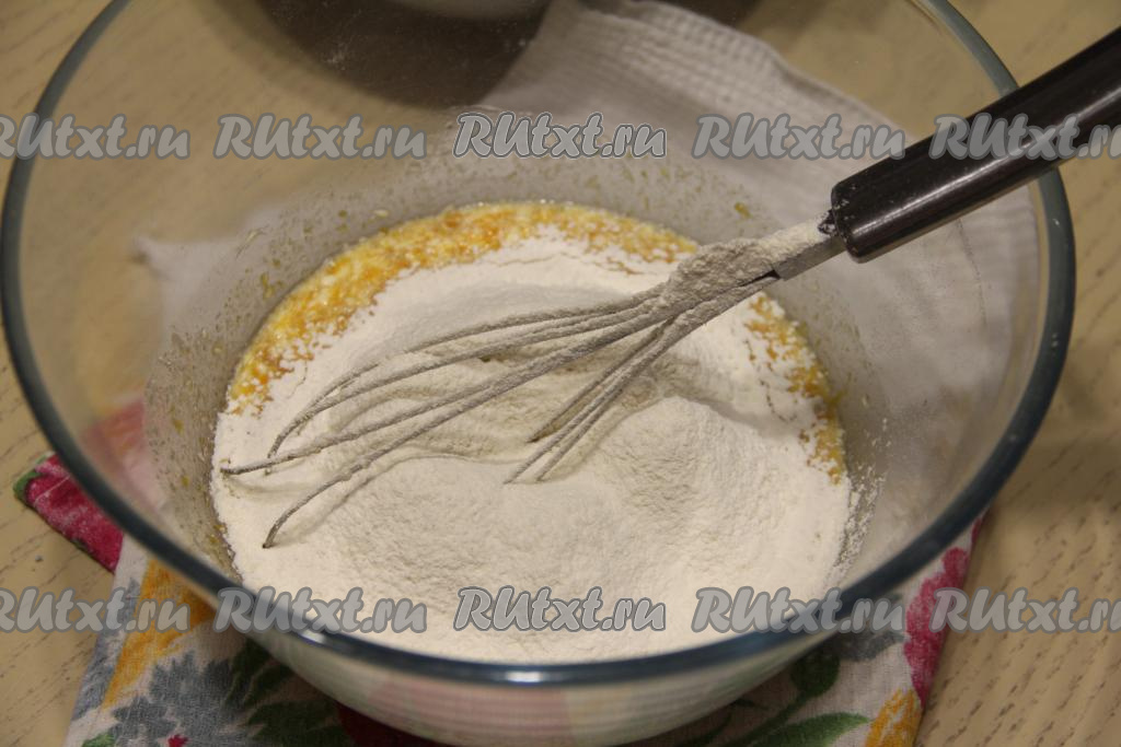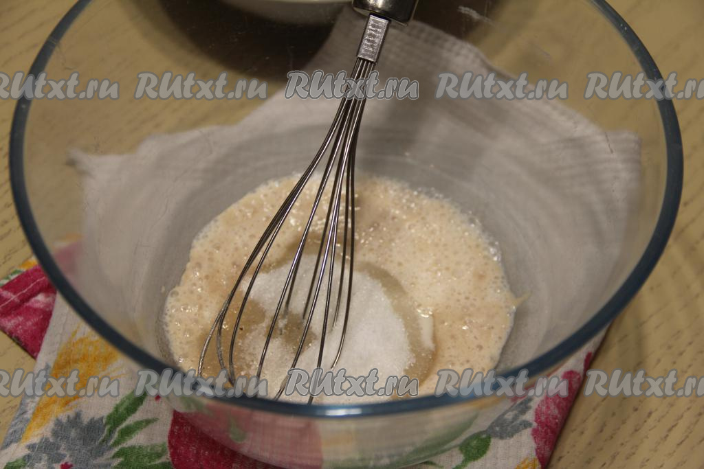 В глубокой миске соединить запенившуюся молочно-дрожжевую смесь и сахар, перемешать венчиком.