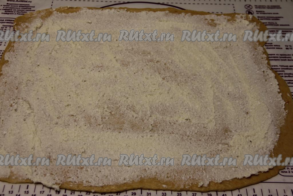 Для получения начинки нужно соединить творог, сахар и 50 грамм мягкого сливочного масла, пробить погружным блендером до получения однородного творожного крема. Получившимся кремом смазать раскатанный пласт теста.