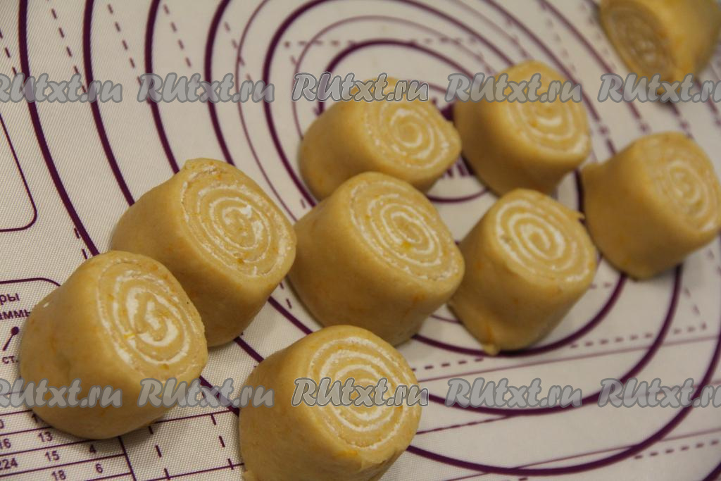 Разрезать рулет (я разрезала ниткой) примерно на 12-13 частей.