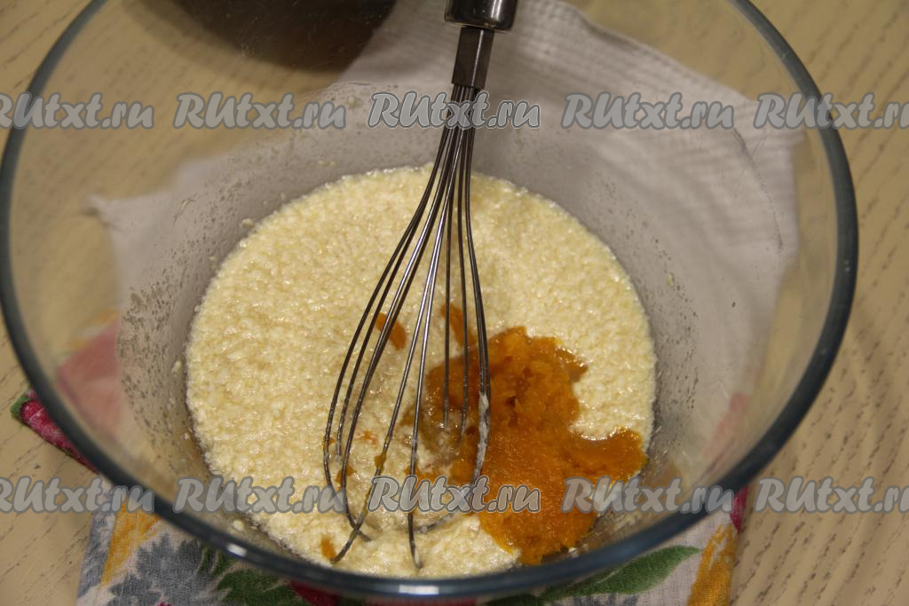 В получившуюся смесь добавить тыквенное пюре, перемешать.
