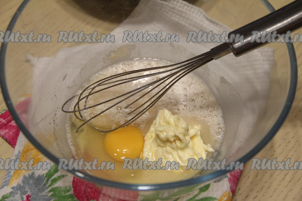 Добавить 50 грамм мягкого сливочного масла и сырое яйцо, перемешать венчиком до однородности.