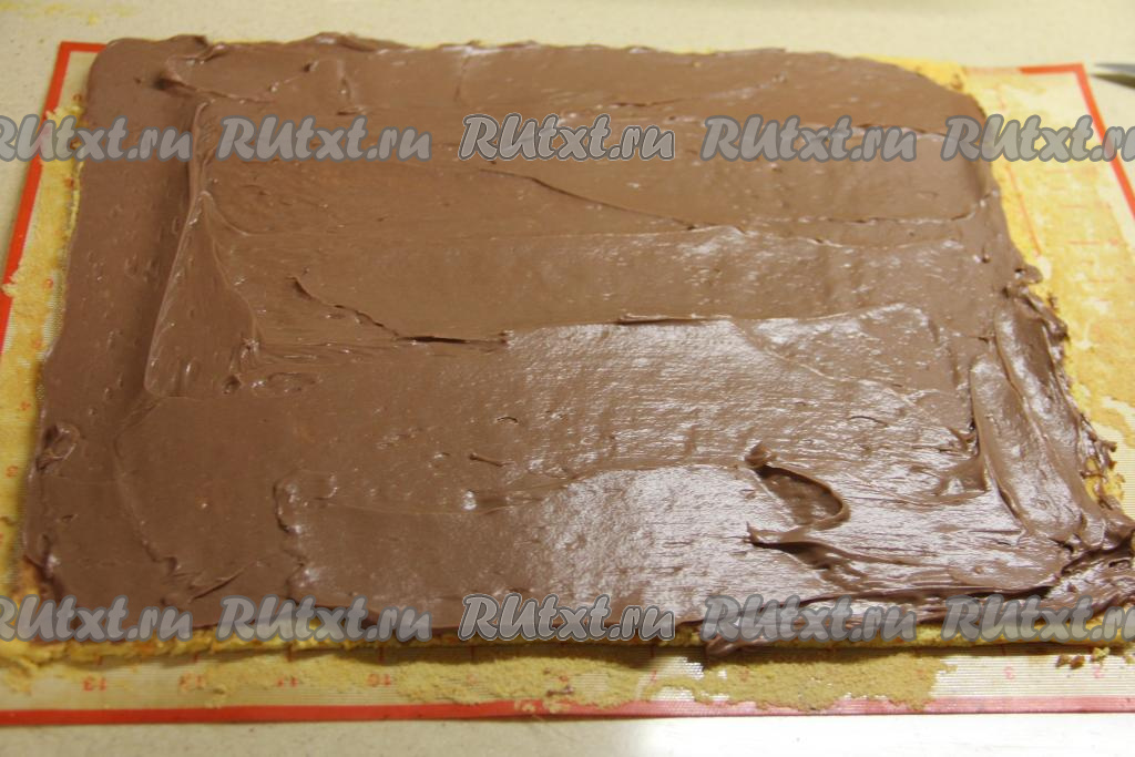 Свернуть корж с кремом в плотный рулет. Завернуть рулет в пергамент и дать пропитаться и стабилизироваться в холодильнике в течение 2-3 часов.